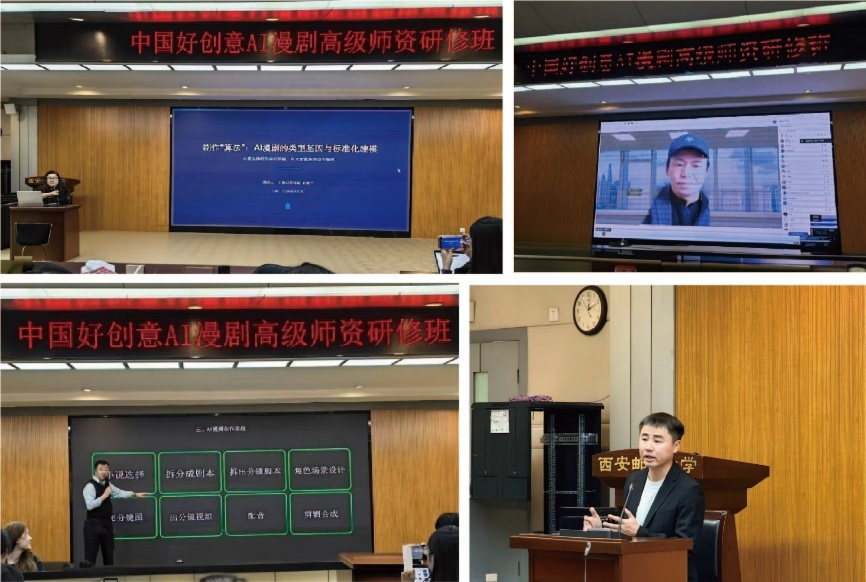 ![]() 夏燮楠老师代表武汉工程大学邮电与信息工程学院艺术设计学院参与《微短剧创艺工坊》授牌 (夏燮楠右三) 培训期间,授课专家围绕四大核心专题展开系统讲解,内容兼具理论深度与实践指导性。专题一“剧作‘算法’:AI漫剧的类型基因与标准化建模”,从概念辨析、类型拆解、元素模块到创作程式,系统拆解AI漫剧的创作逻辑,帮助参训教师掌握标准化创作方法;专题二“AI时代高校产教融合路径探索”,结合国内高校AI漫剧教学实践案例,深入探讨如何实现教育链、人才链与产业链、创新链的有效衔接;专题三“AI融合与突破:漫剧生产的核心技术革新与实践路径”,聚焦AIGC设计工具应用、漫剧全流程制作等核心内容,解析AI技术在漫剧角色塑造、场景生成、后期剪辑等环节的革新应用,分享漫剧大模型等前沿工具的实操技巧;专题四“动漫微短剧的行业发展及合作分享”,结合点众科技(河马剧场)等行业头部平台的运营经验,分析AI漫剧行业发展趋势与商业合作模式,为高校开展校企合作提供思路借鉴。 ![]() 授课专家系统讲解