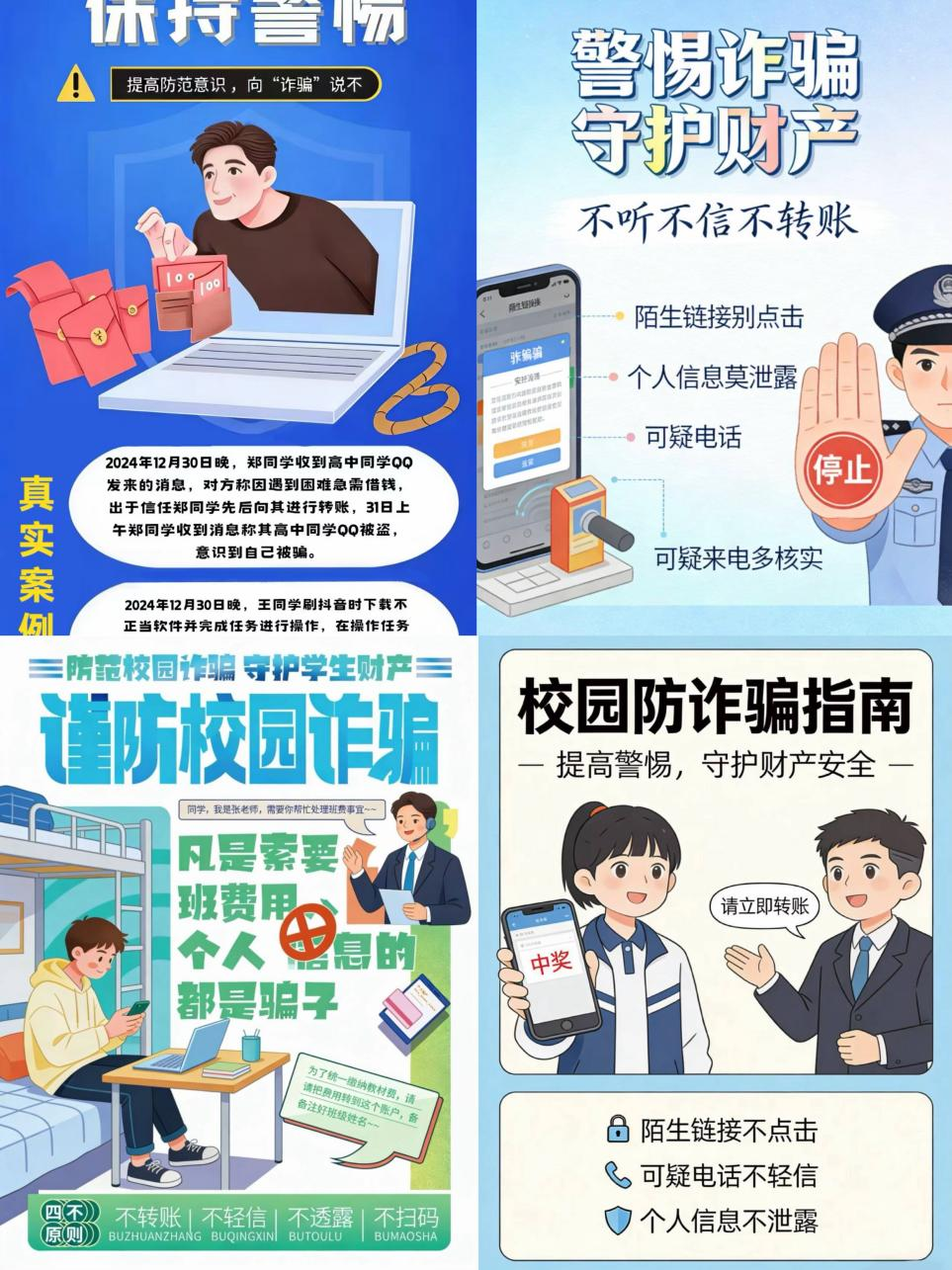 为提升教育活动的吸引力和感染力,学院充分发挥专业优势,组织学生开展防诈骗海报创作活动。同学们结合专业所学,将防诈骗知识要点转化为生动直观的视觉设计,创作出一批主题鲜明、创意新颖的宣传海报作品,既有对常见诈骗套路的警示提醒,也有对防护技巧的趣味解读,通过线下张贴、线上推送等形式广泛传播,让防诈骗知识真正入脑入心。